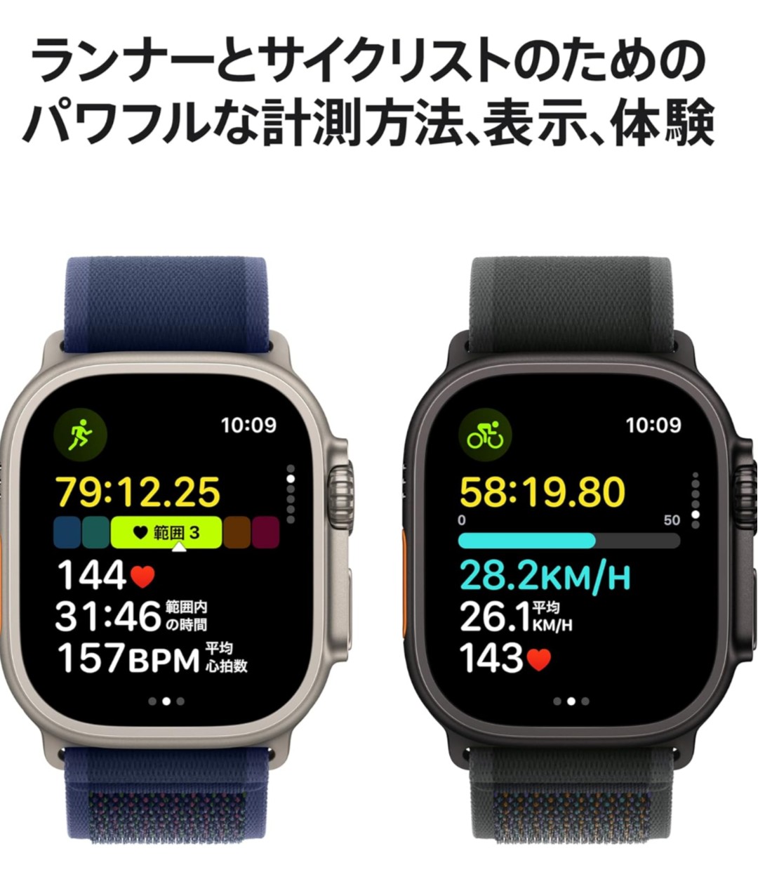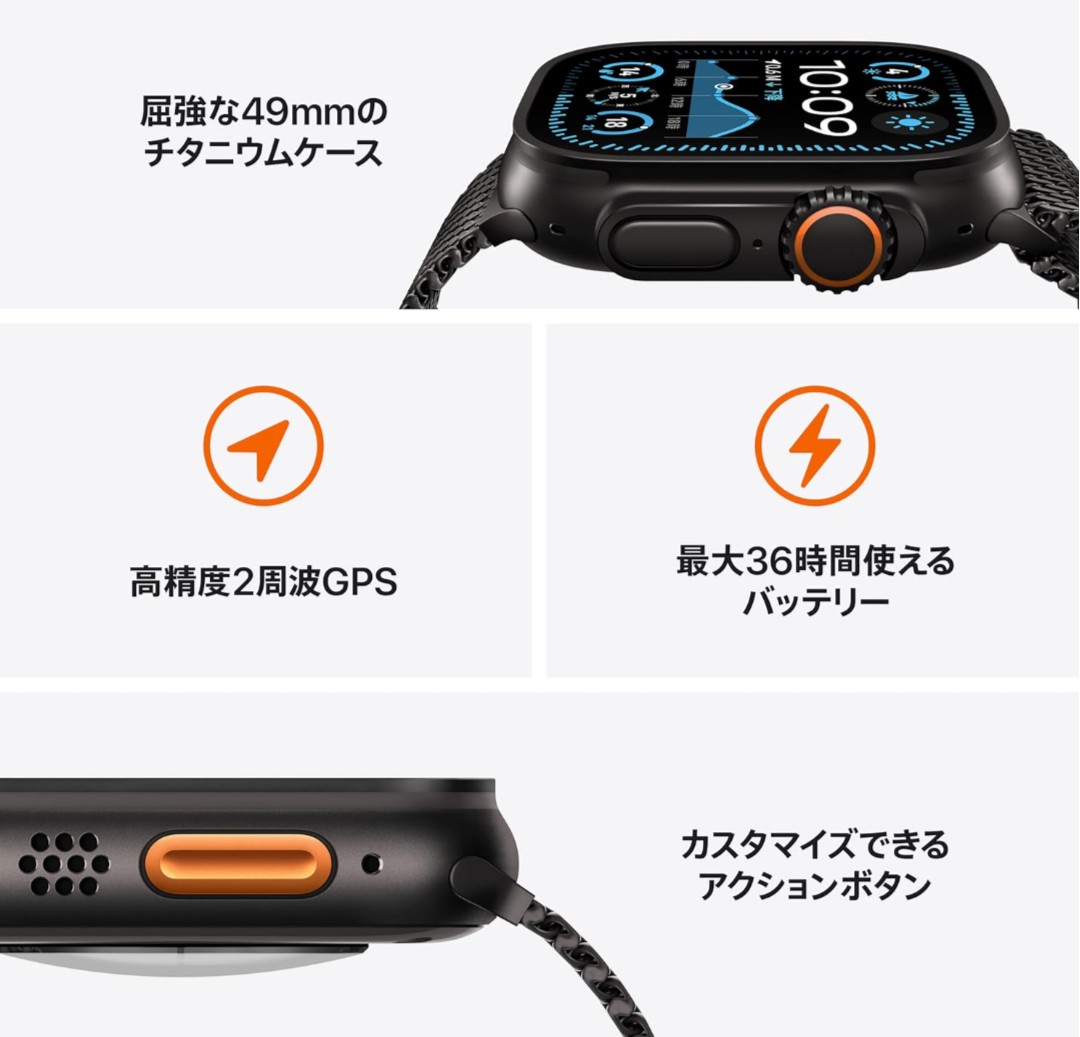 商品の詳細 トップハイライト 接続技術GPS + Cellular 電池の種類リチウムイオン ブランドApple(アップル) スタイルGPS+Cellular 色ブラックチタニウムケースとブラックオーシャンバンド 付属コンポーネントケース, バンド, 磁気高速充電 - USB-Cケーブル(1 m) Apple Watch Ultra 2を選ぶ理由 — スポーツと冒険のための究極の腕時計。ランナー、サイクリスト、スイマー、ハイカー、ダイバーなど、様々なニーズに対応する先進機能を搭載。屈強なチタニウムケースに、サテンのような輝きを持つブラックが新登場。超鮮明な常時表示Retinaディスプレイ。驚くほどの精度を発揮する高精度2周波GPS。健康、安全、つながるためのパワフルな機能。バッテリーは通常使用時で最大36時間、低電力モードなら最大72時間使えます。 極めて屈強かつ万能 — 耐食性のある49mmのチタニウムケース。サファイア前面クリスタル。大きなDigital Crownとカスタマイズできるアクションボタンで、たくさんの機能をすばやくコントロール。MIL-STD 810H準拠をテスト済み。100メートルの耐水性能も持っています。 自由が広がる — 通信サービスプランに加入すれば、iPhoneが手元になくても電話で話したりメッセージを送り合えます。お気に入りの音楽やポッドキャストをストリーミングしたり、マップで道順を調べることもできます。 トレーニングを最大化 — 心拍数範囲やカスタムワークアウトなど、ワークアウトアプリには先進的な計測方法、表示、体験がたくさん用意されています。ワークアウトが時とともにあなたの体に与えている影響を確認できるトレーニングの負荷も、その一つです。 ランナーのための機能 — 驚くほどの精度を発揮する高精度2周波GPS。自動トラック検出。あなたがどれだけ効率的に走れているかを確認できる進化したランニングフォーム指標。カスタマイズできるワークアウトには、ウォームアップ、リカバリーのインターバル、クールダウンの時間も組み込めます。 サイクリストのための機能 ̶ パワフルな計測方法が、サイクリングを次のレベルに引き上げます。速度、心拍数、高度は、ワークアウト表示でチェック。サイクリングのワークアウトを Apple Watch で開始すると、 iPhone 上に自動でライブアクティビティとして表示されるので、簡単に確認できます。パワーメーターなどの Bluetooth アクセサリを接続すれば、「機能的作業しきい値パワー」やケイデンスも映し出せます。 ハイカーのための機能 ̶ Apple Watch だけを身につけて、オフラインのマップをガイドとして使えます。コンパスアプリには、現在の進行方向、高度、経度、緯度など、欠かせないナビゲーションツールが満載。携帯電話通信の電波を最後にキャッチした場所を確認する。コンパスウェイポイントで現在地をマークする。出発地点やルートに戻れるように、バックトレースで今までの道のりを表示させることもできます。 スイマーのための機能 ̶ プールスイミングのために、自動ストローク検知、ラップのカウント、スプリット、セット、カスタムワークアウトを搭載。オープンウォータースイミングでは、ワークアウト概要にルートマップを表示できます。潮位アプリを使えば、世界中にある 115,000 以上のビーチのコンディションをチェックすることもできます。 ダイバーのための機能 ̶ Oceanic+アプリを使えば、Apple Watch がフル機能のダイブコンピュータになります。40 メートルまでの水深と水温を計測するセンサーを搭載。EN13319 にも準拠しています。 健康と安全を守る先進的な機能 ̶ 心電図をとる。不規則な心拍リズムが検知された場合に通知を受け取る。夜間の健康指標を確認する。体に取り込まれた酸素のレベルをチェックする。睡眠を記録して、睡眠時無呼吸の兆候が検出された場合に通知を受け取る。転倒した時や自動車で重大な衝突事故に遭った時に、緊急通報サービスに連絡する。ボタンを押すだけで、緊急時に助けを呼んだり、サイレンを鳴らすこともできます。