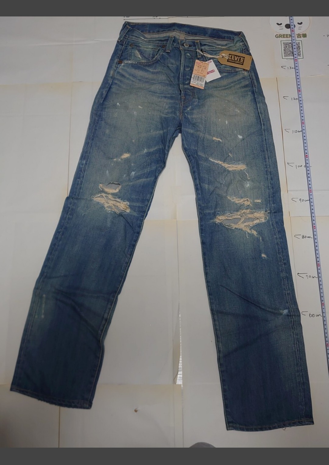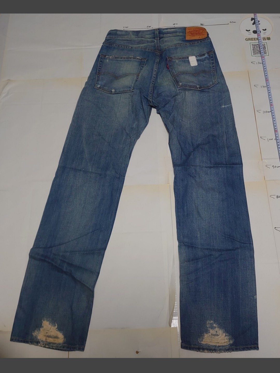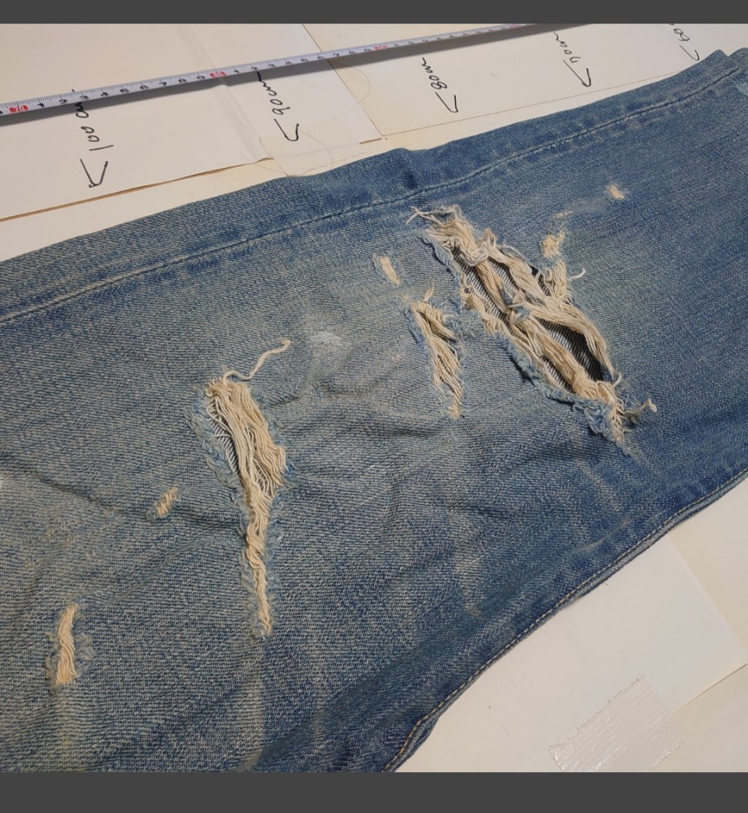 LEVI STRAUSS & Co.:リーバイ・ストラウス&カンパニー SAN FRANCISCO, CAL.:サンフランシスコ、カリフォルニア ORIGINAL RIVETED:オリジナル・リベット XX:最高品質のデニム QUALITY CLOTHING:高品質な服 TRADE MARK:商標 PATINO:特許 BOTEZ:[パッチの品質保証に関連する表記] 100% COTTON:綿100% 501:モデル名 W 32 L 34:ウエスト32インチ、レングス34インチ