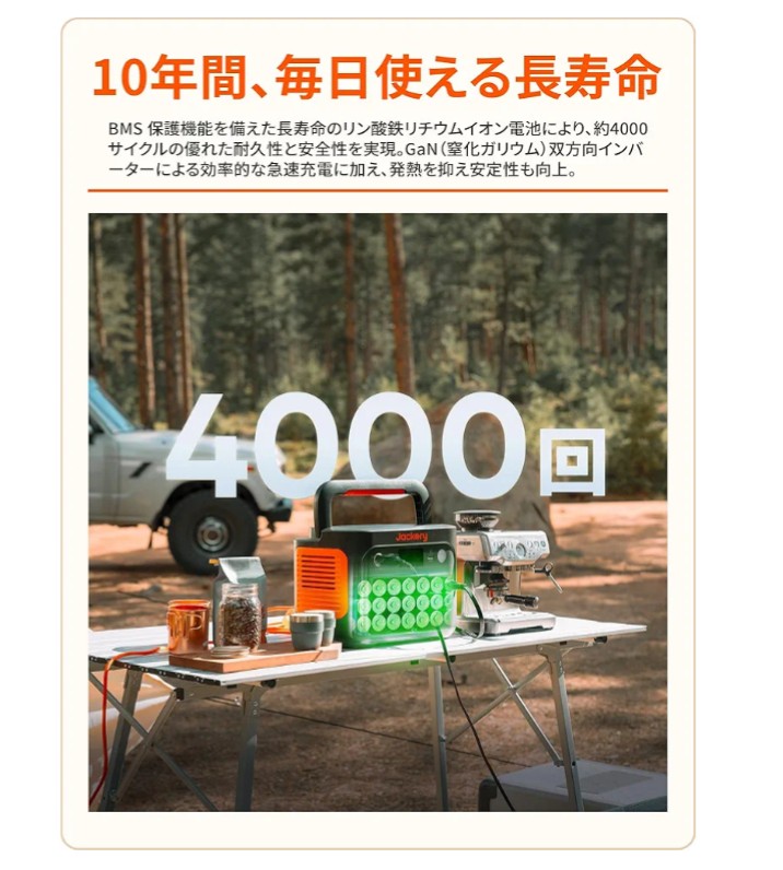 【大容量でも66分で0%から80%まで充電でき、102分(1.7H)で満充電になる】家庭用ACコンセントで最速66分で0%から80%まで充電、102分(1.7H)で満充電。ソーラーパネル充電の場合は最速6時間でフル充電(ソーラー入力 400Wの場合)。選べる多様な充電方法:ACコンセント充電/ソーラー充電/シガーソケット充電(別売)/ハイブリッド充電(ACコンセント+ソーラー、ACコンセント+シガーソケット)加。耐久性も向上。コンパクトながら妥協なきパフォーマンスを実現しました。
