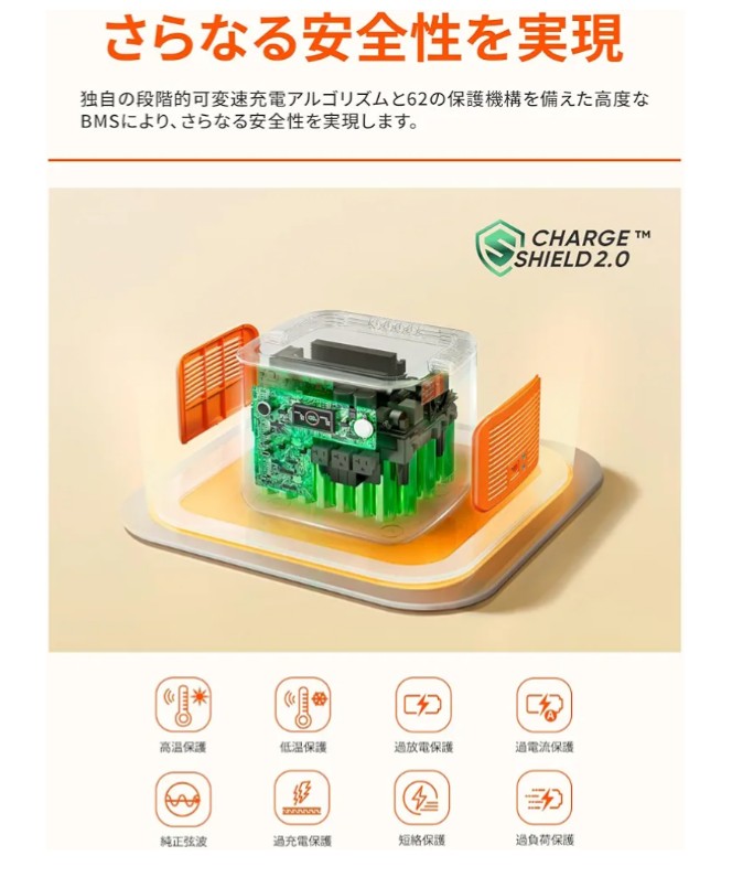 【さらなる安全性を実現した「ChargeShieldテクノロジー2.0」】62種類の保護機能を搭載した、最先端の高速充電技術 「ChargeShieldテクノロジー2.0」 は、独自の段階的可変速充電アルゴリズムを採用することで、さらなる安全性能の向上を実現しました。