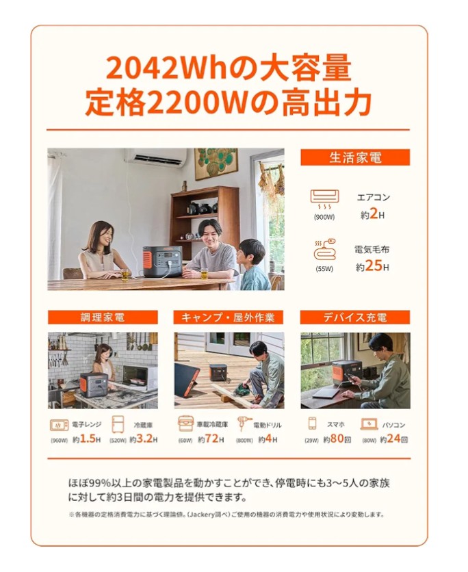 【2042Whの大容量、定格2200Wの高出力】Jackery大人気2000Proの後機器、定格容量45.6Ah/44.8V、コーヒーメーカー(1120W)、ポータブルエアコン(1000W)、電子レンジ(960W)、ケトル(850W) などの家電製品にも対応できます。ドライブ、キャンプ、家族旅行、非常用、防災用に多用途。