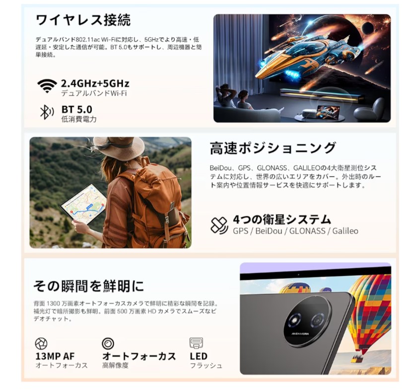 多機能接続+GPS機能で、使い勝手がもっと広がる:Android タブレットをナビ代わりに使ったり、テレビに画面を映して共有したりしたいと思いませんか?TECLAST P50T 11インチ android16 タブレット wi-fiモデルはGPS、GLONASS、BDS、Galileoに対応したマルチグローバル衛星測位システムを内蔵し、高精度な位置情報を取得できるので、外出先のナビゲーションや位置情報サービスに便利です。また2.4GHz/5GHzデュアルバンドWi‑FiとBluetooth 5.0を搭載し、高速で安定した無線接続を実現するほか、ワイヤレス画面ミラーリング機能にも対応し、テレビや対応ディスプレイに簡単に画面を投影して、動画共有やプレゼンテーションがスムーズに行えます。Type‑Cポートと3.5mmイヤホンジャックも標準搭載し、充電やイヤホン接続も手軽にできる充実した接続機能が魅力です。