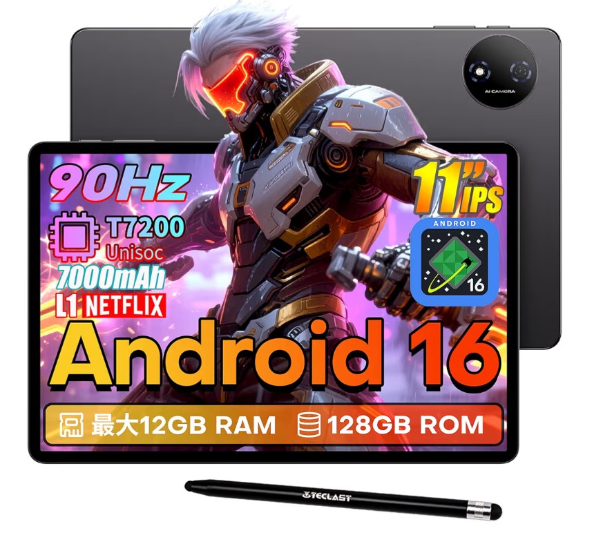 【2026 タブレット Android 16】TECLAST P50T タブレット 11インチ 90Hz IPS画面、WidevineL1対応 Netflix、7000mAh Type-C+3.5mm、12GBメモリ+UFS 128GB+1TB拡張、