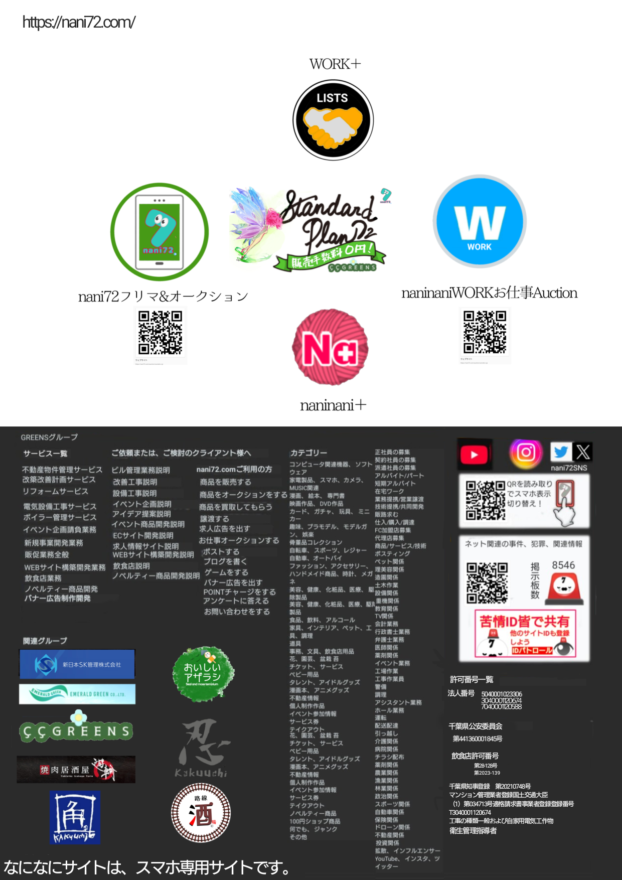 ◀◀◀◀ 「なになにフリマ」とは、インターネット上でフリーマーケットを運営するサイトの名称で、具体的には「なになにフリマ&オークション(nani72.com)」という、自身でフリマサイトを構築する際に使用される表現です。このサイトは、手数料が無料で、商品預かり店の募集や、通常の取引に加えて匿名配送などの取引方法も提供しています。 「なになにフリマ」の主な特徴 サイト名: 「なになにフリマ&オークション」または「nani72.com」というフリマサイトを指します。 手数料無料: 手数料が完全無料のフリマ・オークションサイトであることを謳っています。 商品預かり店の募集: 小物メインの商品を預かるお店や飲食店を募集しており、店舗には無料でバナー広告を掲載しています。 多様な取引スタイル: 匿名配送、ダイレクト取引(個人情報非表示)、店頭渡し取引など、さまざまな取引スタイルが用意されています。 「なになにフリマ」を利用する際の注意点 「なになにフリマ」は、他の主要なフリマアプリとは異なり、独自のプラットフォームを構築・運営する「フリマサイト」であり、一般的なフリマアプリとは異なります。 サイトへの出店や取引を行う際は、利用規約や出品禁止物を必ず確認してください。◀ 見て! 見て! なになにサイトって知ってる #なに? 何? 知らない! 知らない方へ簡単なご説明をしますね!( ꈍᴗꈍ)なになにサイトは、フリマ販売機能 オークション機能 無料譲渡掲載機能 さらに、買取機能 の4機能がご利用いただけますよ! つまり、売買から動物譲渡まで、幅広くお取引ができます。決済機能は、通常取引から、匿名取引、チャージ支払決済もあります。また、売り買でよく耳にします販売手数料ですが、 当サイトは、 【無料】で、ご利用いただけます。 そうなんです! お気づきですか? 他のサイトでの収益が、当サイトを利用する事により、確実に利益は、上がります。 #販売手数料0円 ずーと0円 え! なに?何? それ、なに! なになに ?なに? なにオク ?知らない。知らない方に、是非!知ってほしいフリマサイト、オークションサイト、譲渡サイトなんです!そして、さらに、さらに、当サイトは、なにWORK、お仕事オークション、の求人掲載サイト機能も充実したサイトです、こちらも、掲載無料でご利用いただけます。また、他にない機能、お仕事オークションは、是非!体験して頂きたい機能の一つです。依頼側の提示金額が、まさかの! え! みたいな機能です。え、みたいな? なに? 気になる! 気になる方は、ご登録をお願い致します。(なになに登録)は、メールと、登録IDだけですので簡単ポン!さらにさらに!他のサイトの違いは、掲載するごとに、POINTが貯まります!貯まったPOINTで素敵な商品に交換や、食べ物などにも交換できます。因みに、なになにサイトには、オリジナルゲームもいくつもありまして、そのいくつかのゲームでも、POINTがもらえるのも、魅力の1つ....あとは、なになにプラス!こちらも、お好きな写真を掲載して、POINTがもらえるなどなど、使い方は、自由に拡張できるサイトが、なになにサイトなんです! 皆様の参加をお待ちしております! ★お困りの方や、操作が、解らないなどの、お問い合わせは、 ★「お問い合わせ」にて受付しております。お気軽にご相談ください。 ▷修正修繕作業について、現在も、新しい機能を構築しております、使いやすさを考えた修正作業が 、毎日、行われておりますのでサイトレイアウトが頻繁に現在、変更されますのでご了承くださいますようご協力お願いします。また、なになにサイトでは 「商品預かり店を募集しております。小物サイズの商品を出品者から預って頂き、購入者にお渡ししていただける良心的な、お店、または、飲食店様を募集しております。預かり可能のお店または飲食店様には、バナー広告を 無料掲載いたします期間は、預かり店としての登録を辞退しない限り、継続掲載をいたしますので是非ご検討お願いします。>>>>>>> ご意見、アドバイスなどございましたらなにオク管理部まで、ご連絡をお願いいたします。 .............m(_ _)m .................... ◀◀◀◀◀◀◀◀◀