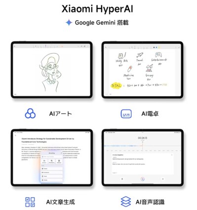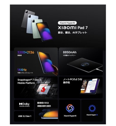 144Hz高精細ディスプレイ 800nits Snapdragon 7+ Gen3 Xiaomi HyperOS 2搭載 AI機能 Google Gemini クワッドスピーカー Dolby Vision 8850mAhバッテリー 45W急速充電 エンターテインメント 作業 会議用