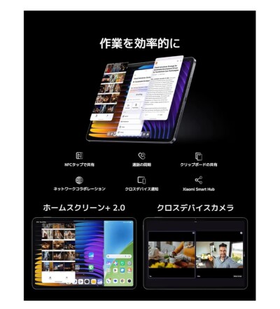 【進化したXiaomi HyperOS 2】Xiaomi HyperOS 2によって強化されたXiaomi HyperConnectは、一新したデザインで直感的な操作体験を提供し、デバイス間の連携をよりシームレスにします。NFCタッチ※共有機能を使えば、デバイスを重ねてタップするだけで瞬時にファイル転送やスマートフォン画面のミラーリングができます。クロスデバイスカメラは、アプリ内でスマートフォンとタブレットのカメラを同時に起動できるため、プレゼンテーションやクリエイティブなワークフローを強化します。