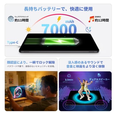 WidevineL1対応 Netflix、7000mAh Type-C+3.5mm、12GBメモリ+UFS 128GB+1TB拡張、Unisoc T7200 8コア、5GWiFi/BT5.0/GPS/13MPリア/GMS/顔認識/無線投影、タッチペン付属、仕事・学習・動画視聴に最適