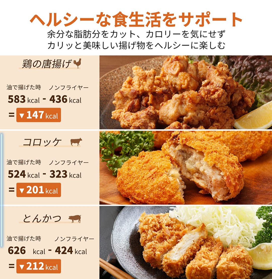 商品の詳細 特徴温度調節 商品の寸法29.4D x 27.4W x 36.5H cm 色ブラック 容量4.8 L 材質プラスチック 商品の推奨用途エアフライ・解凍・再加熱 【ご家族の健康食生活をサポート】ノンオイルフライヤーは360°高速空気循環技術で油を使わず、食材自身の脂を利用して食材を均一に加熱します。中身がジューシー、外はサクッとした食感に仕上がるとともに、油脂は普通より85%までカット、カロリーも大幅ダウンし、美味しくヘルシーな揚げ物が可能になります。家族に健康的な食生活を作りたい方にぴったりの調理家電です。 【4.8L大容量&一台多役】4.8Lの大容量だから、5人家族の家庭でも、1回の調理で家族全員分が作れます。アルミホイルで仕切れば複数料理を同時に調理でき、料理がさらに時短に!ロースト、グリル、ノンフライ調理、低温調理、ドライ、解凍、温め直しといった豊富な調理方法がすべてこれ一台で実現。 【シンプル操作&お手入れ簡単】大きくてわかりやすいタッチパネルが搭載され、料理に合わせて温度(80~200℃)と時間(1~60分)を細かく設定するのはもちろん、7種の自動調理プリセットにより初心者でもワンタッチで揚げ物、ロースト、魚介料理やケーキなど様々な美味しい料理を手軽に調理できます。ノンスティック加工されたバスケットと取り外し式内網は焦げ付きにくく、食洗機で丸洗いも可能、お手入れが楽です。 【メモリー機能&過熱保護】エアーフライヤーにはメモリー機能が付き、食材の具合確認や調味料を入れる際に、バスケットを引き出すと調理が自動的に一時停止、戻すと元の調理を自動的に継続します。そして過熱保護機能も搭載されているため、温度過熱や電圧の不安定等による火災を防止でき、安全性を一層アップし、お子様がいる家族もより安全安心にご利用。 【PSE認証済&安心保証】CROWNFULノン フライヤーは電気用品安全のPSE・ETL・CEと食材接触材安全認証済みです。お客様に安心を感じながらCROWNFUL製品をご利用いただけるよう、一年間の品質保証と生涯アフターサービスを提供しております。