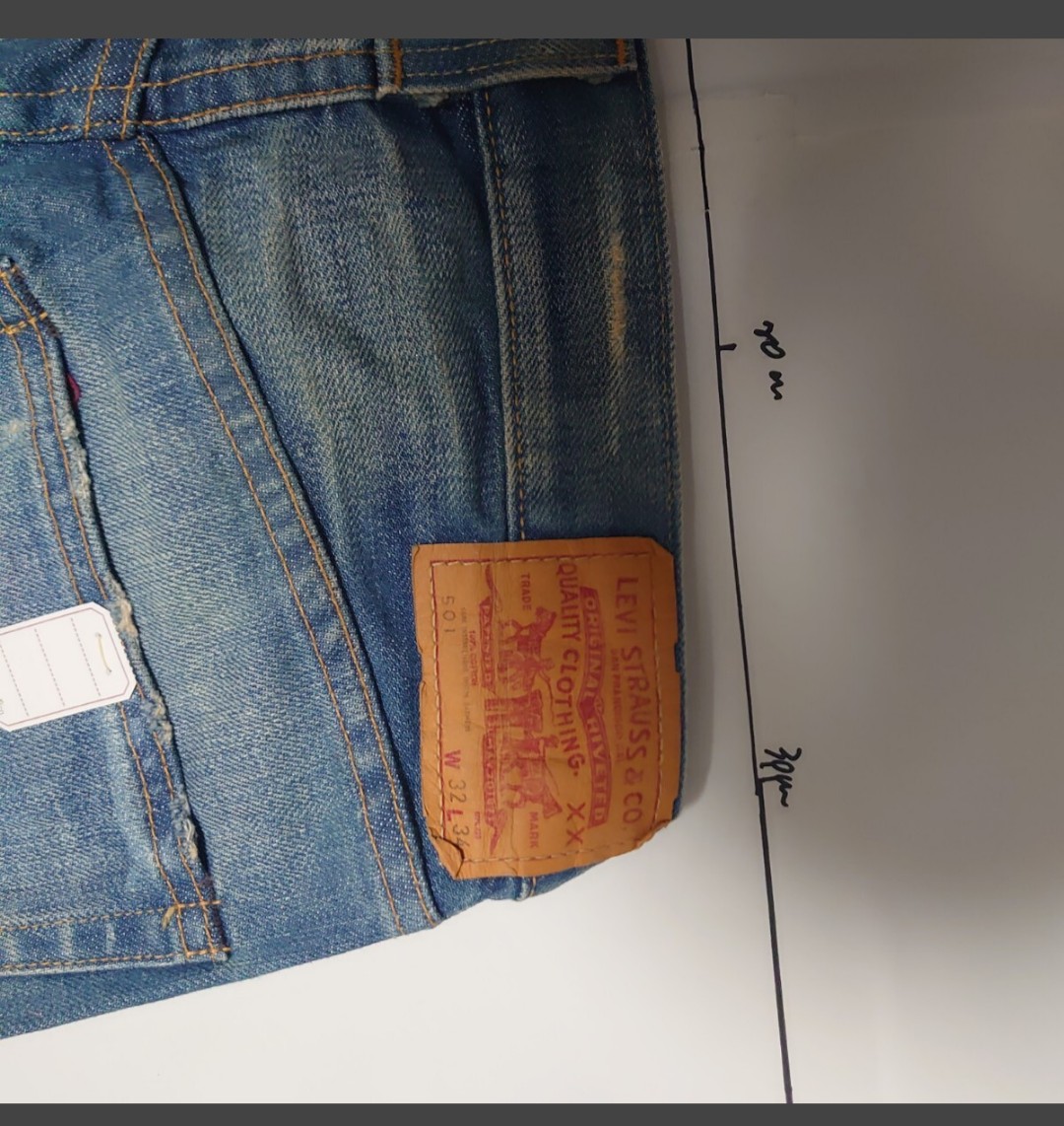 LEVI STRAUSS & Co.:リーバイ・ストラウス&カンパニー SAN FRANCISCO, CAL.:サンフランシスコ、カリフォルニア ORIGINAL RIVETED:オリジナル・リベット XX:最高品質のデニム QUALITY CLOTHING:高品質な服 TRADE MARK:商標 PATINO:特許 BOTEZ:[パッチの品質保証に関連する表記] 100% COTTON:綿100% 501:モデル名 W 32 L 34:ウエスト32インチ、レングス34インチ