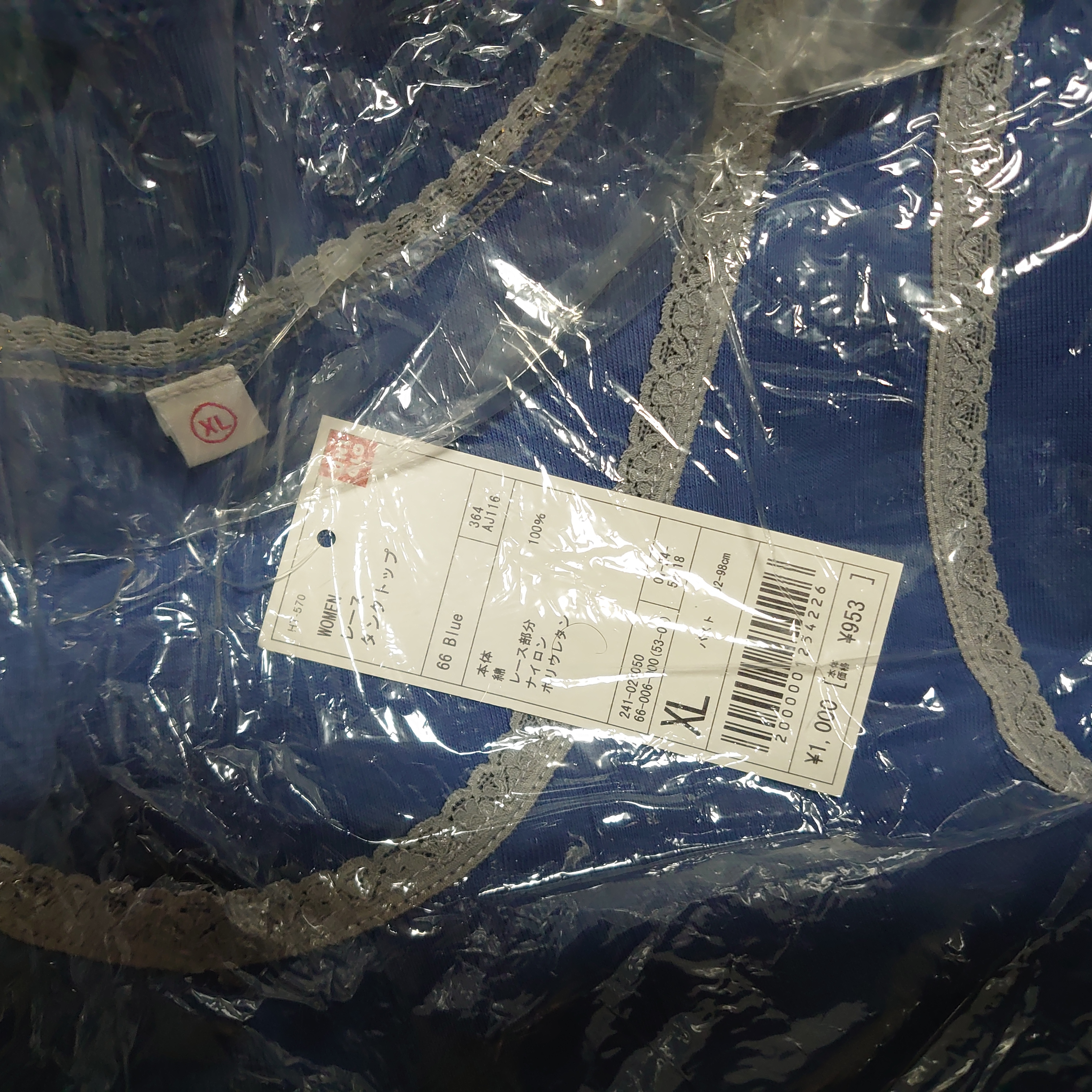 このタンクトップは綿100%の本体に、襟元や袖ぐりにレースがあしらわれたフェミニンなデザインです。ユニクロのタグには商品番号「241-02-050」