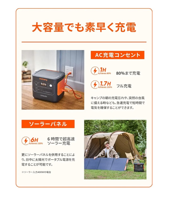 【大容量でも66分で0%から80%まで充電でき、102分(1.7H)で満充電になる】家庭用ACコンセントで最速66分で0%から80%まで充電、102分(1.7H)で満充電。ソーラーパネル充電の場合は最速6時間でフル充電(ソーラー入力 400Wの場合)。選べる多様な充電方法:ACコンセント充電/ソーラー充電/シガーソケット充電(別売)/ハイブリッド充電(ACコンセント+ソーラー、ACコンセント+シガーソケット)加。耐久性も向上。コンパクトながら妥協なきパフォーマンスを実現しました。