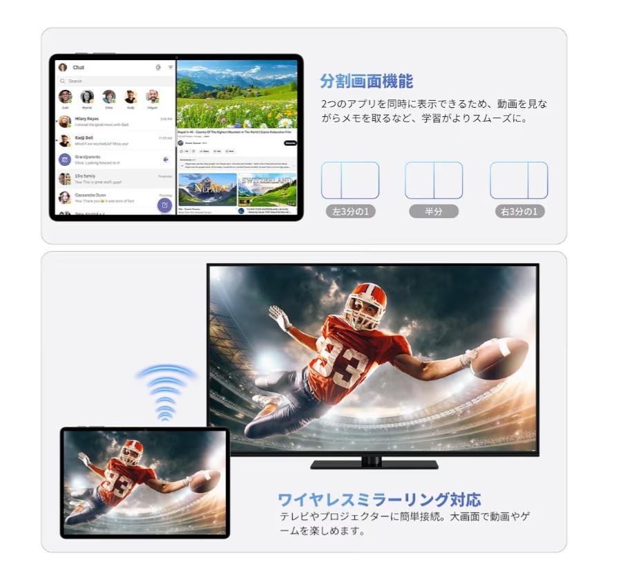 多機能接続+GPS機能で、使い勝手がもっと広がる:Android タブレットをナビ代わりに使ったり、テレビに画面を映して共有したりしたいと思いませんか?TECLAST P50T 11インチ android16 タブレット wi-fiモデルはGPS、GLONASS、BDS、Galileoに対応したマルチグローバル衛星測位システムを内蔵し、高精度な位置情報を取得できるので、外出先のナビゲーションや位置情報サービスに便利です。また2.4GHz/5GHzデュアルバンドWi‑FiとBluetooth 5.0を搭載し、高速で安定した無線接続を実現するほか、ワイヤレス画面ミラーリング機能にも対応し、テレビや対応ディスプレイに簡単に画面を投影して、動画共有やプレゼンテーションがスムーズに行えます。Type‑Cポートと3.5mmイヤホンジャックも標準搭載し、充電やイヤホン接続も手軽にできる充実した接続機能が魅力です。