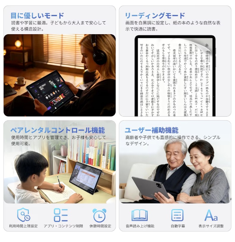 低ブルーライト護眼モードで、長時間使用も目に優しい:長時間のオンライン学習や電子書籍の読書、動画視聴をすると、目の疲れが気になりませんか?TECLAST P50T アンドロイド タブレット 11インチは専用の低ブルーライト護眼モードを搭載し、画面から放出される目に負担をかけるブルーライトを効果的に低減してくれます。子供が長時間オンライン授業を受けるとき、大人が仕事で長時間画面を見るとき、寝る前にリラックスして動画を見るときなど、目への負担を軽減し、長時間の使用でも疲れにくい視聴体験を提供し、家族みんなで安心して使える android16 タブレットです。