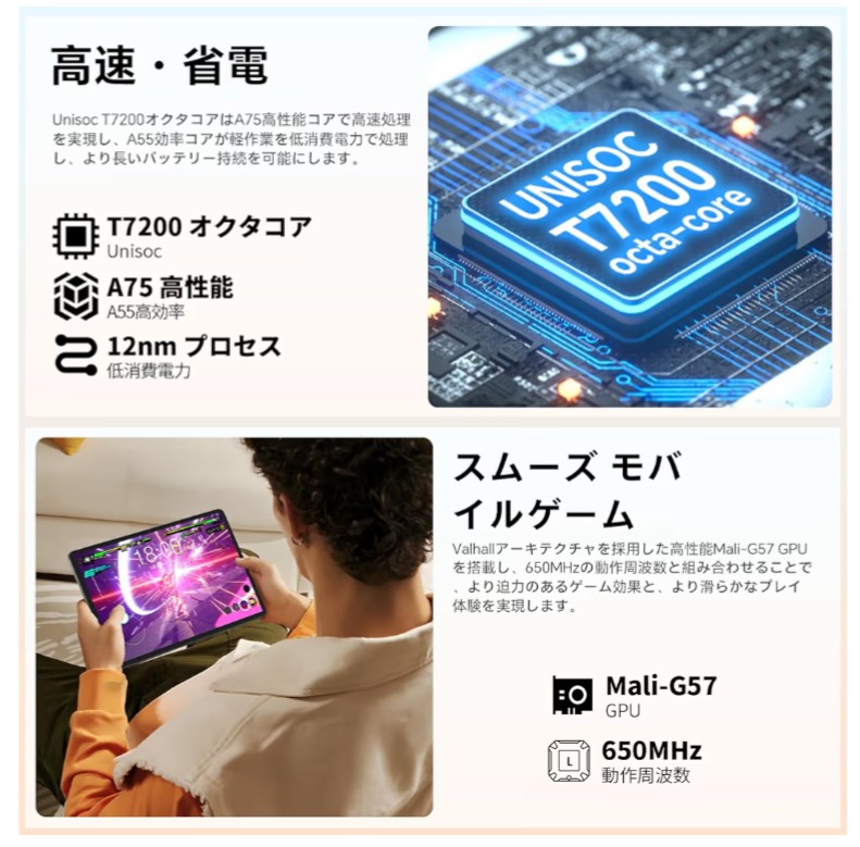 高性能8コアチップで、複数の作業もスムーズに動く:在宅ワークで複数の業務アプリを同時に開いたり、学生が勉強アプリと動画を同時に使ったり、趣味で写真の簡易編集や動画のトリミングをしたりするとき、android タブレットの動作が重くなったり固まったりするストレスを解消したくありませんか?TECLAST P50T タブレット11インチ本体はUnisoc T7200 8コアプロセッサを搭載し、2つの高性能A75コアと6つの高効率A55コアを組み合わせた設計で、日常で使う人気アプリの起動が瞬時に行われ、ストレスなく操作できます。在宅ワーカーがExcelやWordの資料を編集しながらチャットツールで連絡を取ったり、学生がオンライン授業を受けながら問題集アプリを開いたり、主婦が家計簿アプリとネットショッピングサイトを同時に使ったりするなど、少し負荷のかかるマルチタスクも、動作の遅れやフリーズを感じることなく快適に操作できます。日常的な作業や趣味、学習のニーズに完全に応えられるパフォーマンスを備え、高額なアンドロイド16 タブレット 11インチに劣らない使い心地を実現しています。