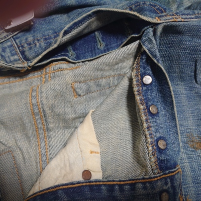 モデル: リーバイスの象徴的な「501」モデルで、フロントがボタンで開閉するボタンフライ仕様です。