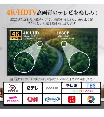 【4K/地デジ対応 & 超広域350マイル受信】 最新スマートICチップ搭載でATSC/DVB-T2/ISDB-Tなど地デジ信号を安定受信。ブースター内蔵により最大350マイル(約600km)の広範囲をカバーし、4K・1080Pテレビチャンンネルをノイズ低減の高精細画質でご視聴いただけます。VHF(170-240MHz)/UHF(470-860MHz)のデュアル周波数帯域に対応。