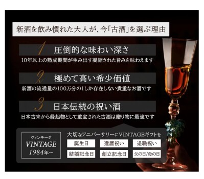 【希少性】日本の熟成古酒は古来皇室のお祝いの儀式でも利用されてきた日本の伝統的なお祝い酒ですが、大変希少なお酒のため市場にはほとんど出回っておらず、お酒好きな大切な方へのこれまでにない驚きの贈り物としてご利用いただくケースがとても多いです。