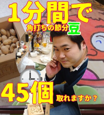 間もなく1月が、終わります。2月3日は、節分イベントがあります。1分間45個の豆を、移動できたらお会計半額!!