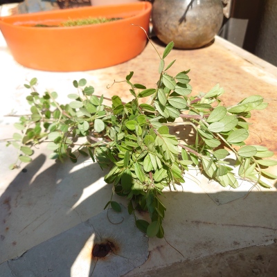 挿し穂の準備: 上部の葉を2-3枚残し、下の葉は取り除きます。水分の蒸散を防ぐため、残した葉は半分に切るのが効果的です。